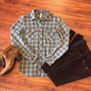 RVCA, green, brown and turquoise, plaid flannel shirt in like new condition. Amazing with jeans or the Soft Surroundings brown velvet skinny jeans as shown in the cover photo, with brown fringed booties! The actual color was hard to photograph but is closest to photo #2. Metallic gray color buttons.