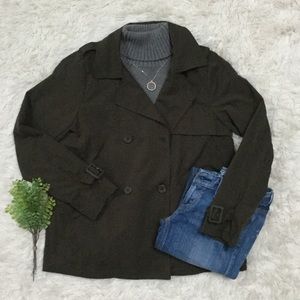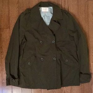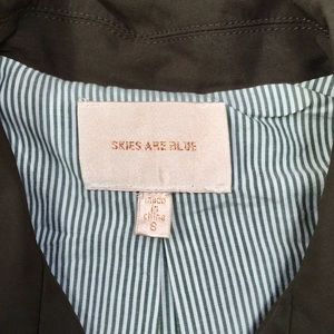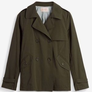Skies Are Blue double breasted trench cost in olive. Front buttoned pockets, buckle detail on sleeves, split hem back. Purchased via Stitch Fix.