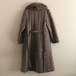 1970s true vintage mocha nylon acetate double breasted long trench style quilted puffy coat with tie belt, belted wrists, two welt pockets and rabbit fur lapel, lined with mocha acetate. Fur shows slight wear but nothing damaging or noticeable. Size is vintage 12 but best fits a modern 2. Gorgeous condition!
