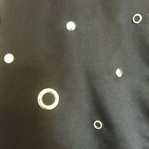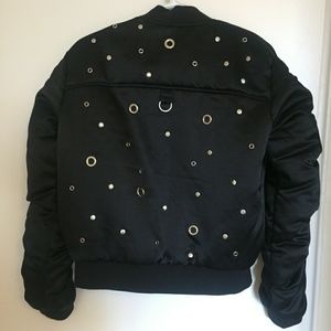 Super cute jacket is NWT, never been worn. Features silver grommets and studs throughout. Has an elasticized collar, cuffs and waistline; ruched sleeves and side pockets. Extra hardware included.
