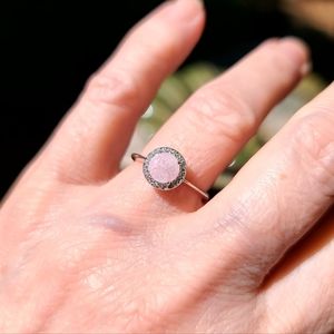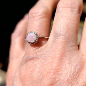 This is a super cute NEW sz 6 ring of solid 925 sterling silver. The center stone is a 1.7k pink topaz surrounded by more white Topaz accent stones. It's dainty but has LOTS of sparkle and pizzazz!