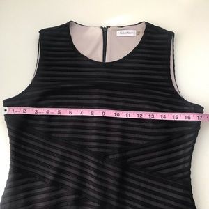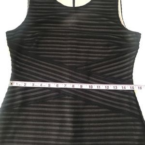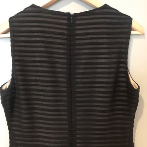 Little black dress features body-hugging silhouette and stripe texture, fully lined.