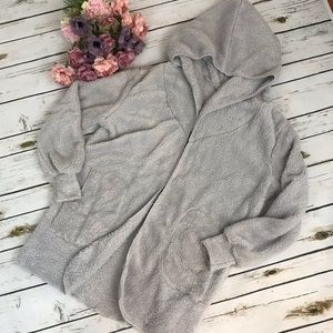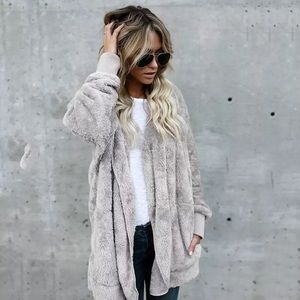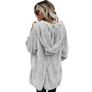 Plush Gray Fleece Hooded Cardigan with Pockets