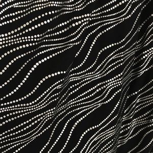 This is a fun dress! Great for NYE or holiday parties! Black with silver dot details. A little sash thing hangs in front. Strapless, stretchy, and flowy, and fits more like a medium I think. Worn once, no rips or stains.