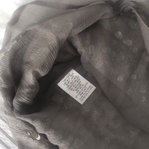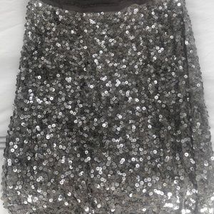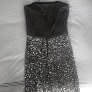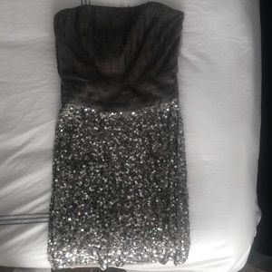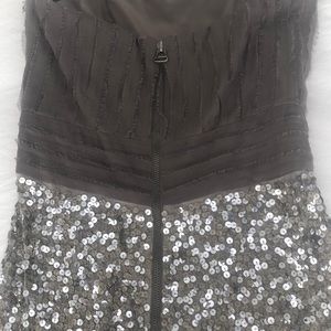Taupe color. The top is GORGEOUS texture while the bottom is fun sequins! All sequins in tact! Bottom is lined (not see through and top lining is silk and in PERFECT condition. Does not slide down and super comfy. I wore this dress to a wedding and that’s it!