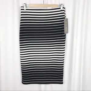 New never worn with tags. Stretchy forgiving fabric and waist line. Polyester and Spandex.