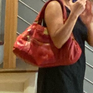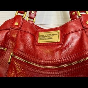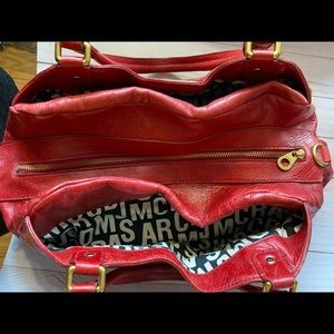 This soft, Italian leather satchel by Marc Jacob is so eye-catching in cherry red! It is in beautiful condition with a bit of yellowing in the interior fabric (see photo).