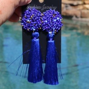 New! Large Royal Blue Boho Earrings Post Drop Tassels