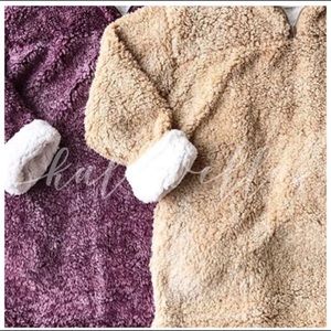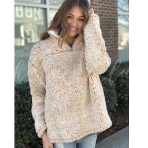 Beautiful beige faux fuzzy Sherpa sweater is gorgeous. So soft comfy stylish warm and cute. Has pockets and sleeves fold over white along with zip neck area.