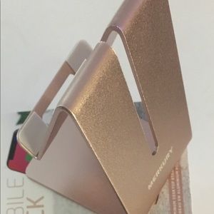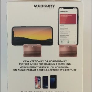NWOT “Mercury Mobile” Dock (stand) to hold a cell phone...hands free. NEW. This metal stand hold a cell phone in a vertical or a horizontal position, leaving hands free. Compact and portable. Very lightweight. Comes on its own box. A novel must-have to keep on your night stand or near a computer. The angle makes it easy to view the screen without lifting or holding the phone. Makes a great gift for any owner of a cell phone....LL💕