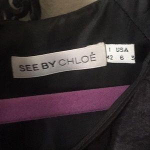 See by Chloe little black dress. Purchased at a fancy vintage boutique in L.A., it features a pleated skirt with unique satin bodice that opens to reveal back-zip close and belt that can be tied in front or back. 64% polyester, 36% nylon. 36” from shoulder to hem.