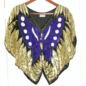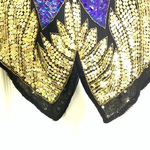 Great used "vintage" condition butterfly sequin/beaded top. Has some areas where beading/sequin has come loose and missing but not drastic. 100% pure silk with a rayon lining. Black under, gold/blue/white above. No exact size tag, however this top has a designated arm hole area. I have listed approx measurements below. Has small shoulder pads.