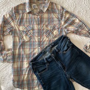 AE skinny jeans and long sleeve shirt size L but fits like a medium. Non-smoking home. Cleaning out closet. Nothing wrong with either one.