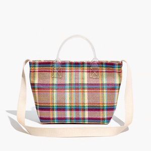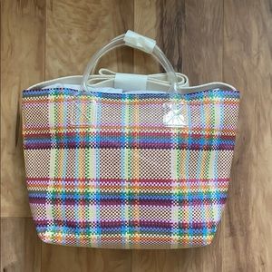 Madewell Small multicolored Tote Bag. Durable and adorable with cool see-through handles, this mini woven beach bag is just the right size for carrying your sunglasses, SPF and a juicy paperback (aka it's the ultimate seaside tote). Woven fabric. Approximately measurements: 15 1/2" strap drop. 7 7/8"H x 11 1/4"W x 7"D. Excellent conditions. Brand new with tag