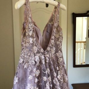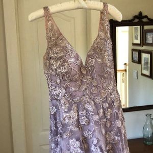 Color: Orchid. Sheer elegant Rosette antique gold threading lace with pin dot tulle overlay. Light weight, double lining for body and very comfortable. Minor alterations to the arm straps and length. Mother is 5’5” wore with 3” heels. Waist: 34” under bust: 30” Length-of dress from waist seam: 42.5”