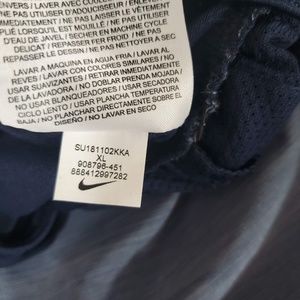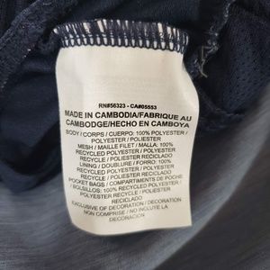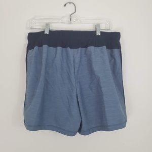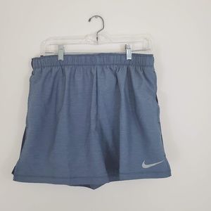 This is a pair of running shorts from Nike in the Dry Fit Challenger style. Features built in inner brief, two pockets and drawstring and elastic at waist. NWT. 100% polyester. Heathered blue-grey color with darker navy blue trim at sides and back. Inseam 5 inches, outseam 15.5 inches.