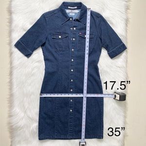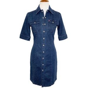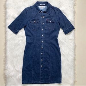 Tommy Hilfiger short sleeve denim dress. Full snap front buttondown, silver logo buttons, embroidered TH flag logo on bust pocket. Structured sheath fit with vertical seams. Mid weight stretch denim fabric (4% spandex). Measurements in photos. Great condition.