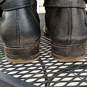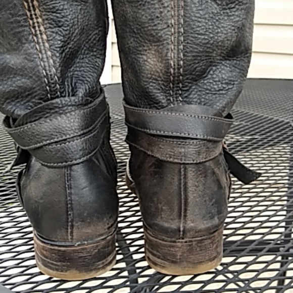 Bed Stu women's boots size 8.5. Genuine leather upper. Factory destressed. Back lace up 4". Side zip seen in photo 8. Color is blackish brown. These shoes are in excellent condition, just designed to look worn. The heel is 1.25".