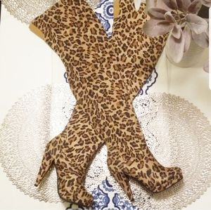 Sexy thigh high leopard print high heel boots. Man made upper/Vegan Suede. Heel 4.5" with small 3/4" Platform in front. Thigh opening measure 8.5" flat and has elastic to allow for more and secure the top. Worn once in like new condition and from a smoke-free home.