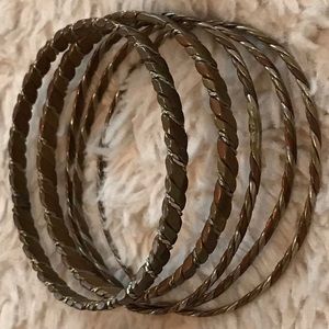 This is a Bundle of 5 Bronze Tone Bangle Bracelets with Gold tone and silver tone detail. Two bracelets are the same and the other 3 bracelets are the same.