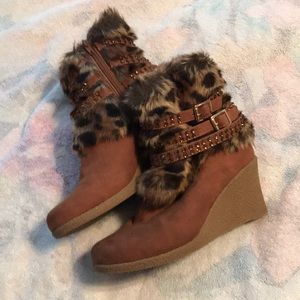 NWOT Vegan suede and faux leopard fur trim and lining. Wrap straps adorned with copper color crystals. Wedge heels for height with stability. Absolutely adorable and unique. Functional in cooler weather but so too very cute and stylish. Happy to answer any questions and accept offers. Smoke free home. You can’t go wrong with these beauties.