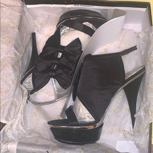 Worn Once and Box Kept. Satin Bows 1”Platform with 5” Heel. Ankle Strap and Silver Trim.