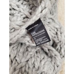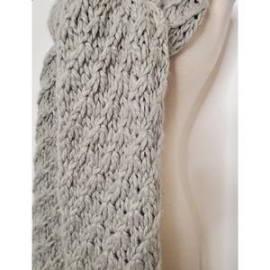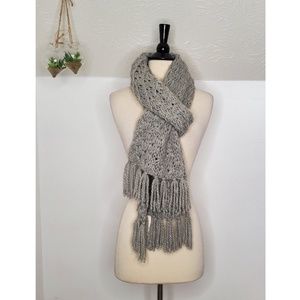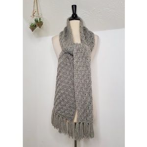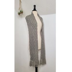 Soft and cozy gray cable knit scarf. 81% Acrylic, 19% Wool. Dry Clean Only. Gently pre owned. 9" width, 90" length including tassels.