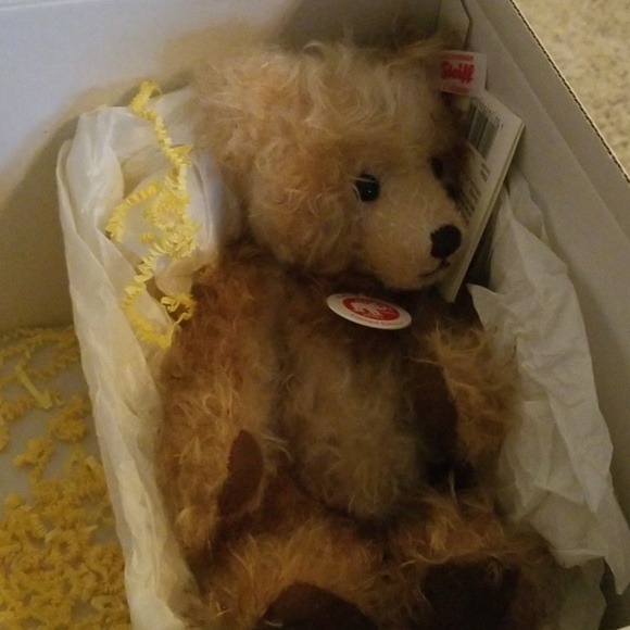 Benotime Teddy bear has a removable pouch on his back, and if you want, you can fill with coffee. His cream and brown mohair coat combines all the colors of coffee. As a thoughtful friend he has even brought you a Steiff coffee cup made by Villeroy & Boch. Simply take your bear with you to work and you will always have your coffee close at hand.