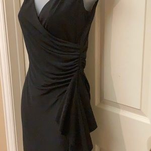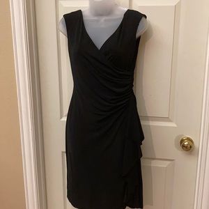 WHBM LBD! Flattering faux wrap dress with plunging, neckline and curved ruching at side. Pull-on style, easy and lightweight to wear. I love this dress!If I could still fit in it I’d be wearing it!!!! Very flattering LBD. 37.5” long