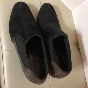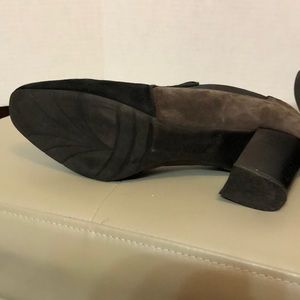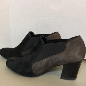 Suede two tone booties. Stretch on sides. Have been worn but still look good. There is a scratch and gash on heel that can be fixed. See pics.