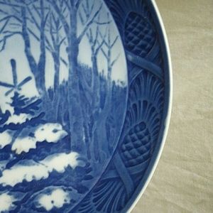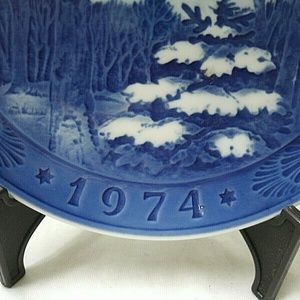 Royal Copenhagen Collector's Plate from 1974. Blue and white, porcelain. Owl with moon in forest design. Tittle: Winter Twilight. Artist: Kai Lange. Made in Denmark. It has two holes on the back for hanging. 7 1/4 inches in diameter. Good condition - no chips or cracks. Stand is not included. Great addition to a collection. Great for owl lovers!