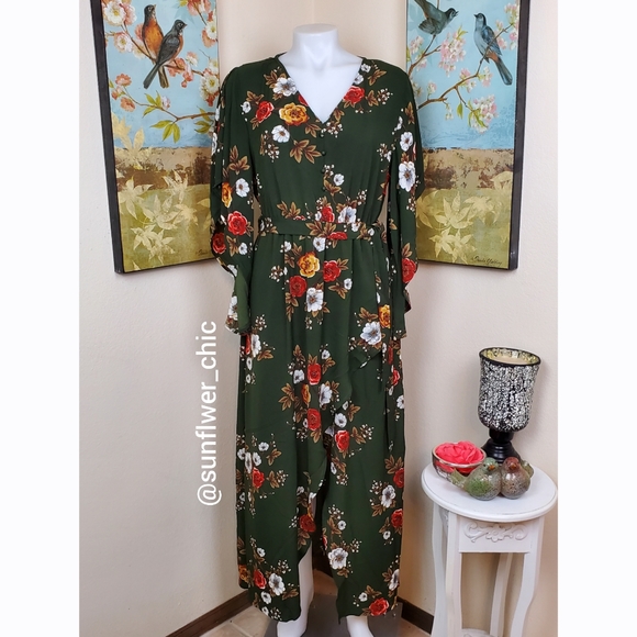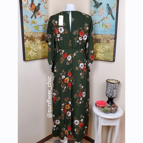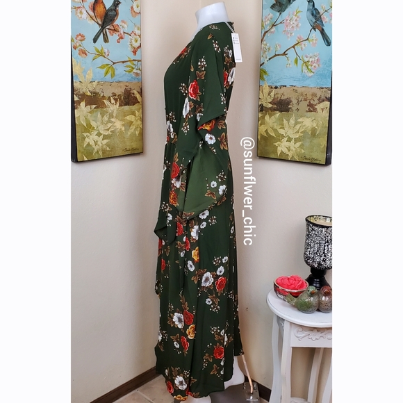 ποΈ Bohemian inspired front wrap floral dress. Gorgeous floral print on a deep hunter green polyester material with a front wrap skirt, half bell sleeves, key hole slit in rear, front accent buttons and tie waist. Absolutely adorable dress π
