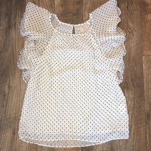 White and Black Sheer Ruffle Babydoll Top with Small black beads along the ruffles of the sleeves and black dots. Size:M