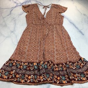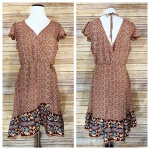 Fun and boho chic Band of Gypsies B.O.G. Collective Boho Flutter Boho Dress! Gorgeous brown fixed wrap dress (sewn together at waist) with a side and back neck tie, adorned with a gorgeous medallion paisley design and an asymmetrical hemline. Unlined. In great condition!