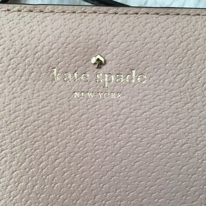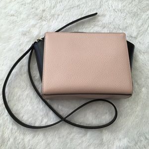 A saffiano leather Kate Spade New York bag, styled with flared, colorblocked sides. Inset top zip and lined, 2-pocket interior. Adjustable shoulder strap. No dust bag. Tag was removed but never used.