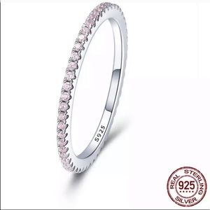This is a beautifully crafted ring on a very slender silver band with light pink cubic zirconia all the way around. It is stamped 925 inside the band. Great ring to stack with others.