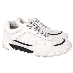 These authentic Chanel sneakers are in good pre-loved condition. There is discoloration to the soles, exterior orange mark on instep on one sneaker, minor discoloration on interior heel.