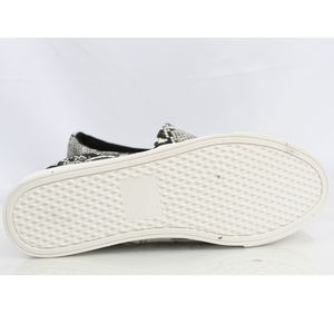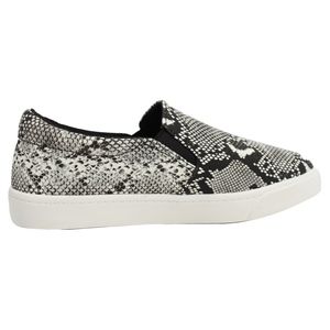 White python faux leather round toe white rubber soles slip on sneakers, model is a size 7 and a size 7 fits her perfectly.