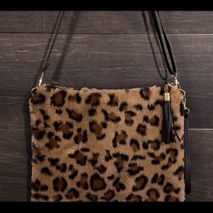 Animal print Crossbody purse. Soft Vegan Fur. Such a fun on trend bag. The adjustable strap can be removed and bag becomes a wristlet. Straps are pleather, hardware alloy. One small inside open pouch.