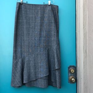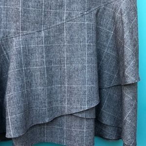Menswear look glen plaid skirt in grey with white, has a smooth silhouette that flows into tiered lagenlook hemline in the front. It's a lightweight wool/poly/other (see pic) blend fabric with a soft polyester lining. Gently worn and in very good condition. Euro size-tag says 16 US so please go by the measurements: waist laid flat about 18", hips about 23", length about 34"