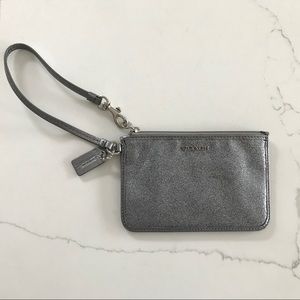 Coach glitter wristlet. Only used to carry change on a trip. Excellent used condition! Zippered pouch with two card slots inside. Handle can unclip from zipper to attach to purse or other item. So cute and perfect for the holidays!