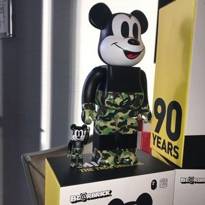 This is an exclusive two piece set as seen, which sold out worldwide in the first day! (Released 11/02/2019) To celebrate the 90th anniversary of Mickey Mouse’s birth, Be@rbrick x Bathing Ape x Mickey Mouse have come together for a 3 way collaboration. (2 piece set as seen which includes both 100% and 400% size figurines).