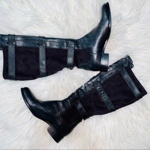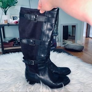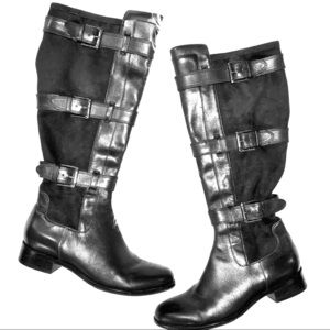 Cole Haan Nike Air Avalon riding style boots. Size 7 and 8 available. Excellent preowned condition. Boots have 3 buckle details. They are leather and suede back shaft. The suede is a faux Ultrasuede (registered trademark). Size 8 boots have minor wear to the heels. See all pictures.