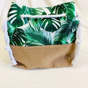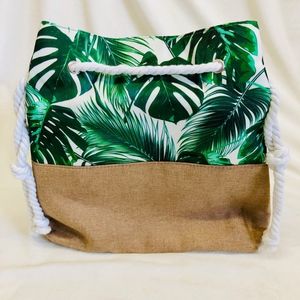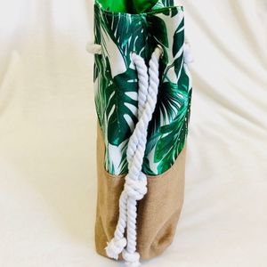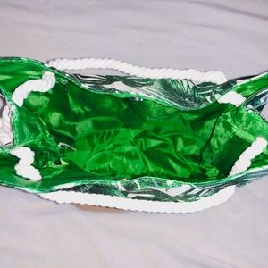 Bag has stylist white ropes for pull closure, an inside zipper pocket, and a magnetic clasp at the top.