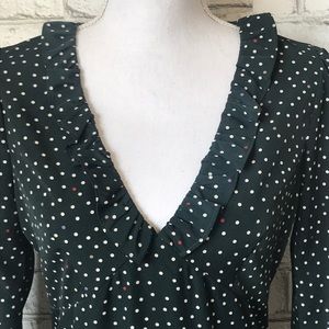 This adorable hunter green long sleeve dress is adorned with tiny dots in white, red, purple, and pale green. Has a v-neck with ruffle detail around the neck. Hidden side zipper. 100% Polyester