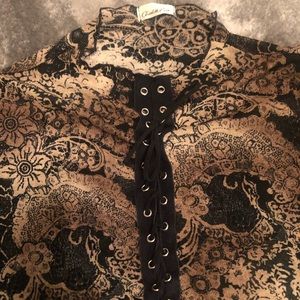 Charlotte Russe Black & Brown Abstract Floral Print Lace-Up Top W/Split Bell Sleeves. Tag has been removed but size medium and laces can be adjusted to fit tighter or looser.