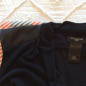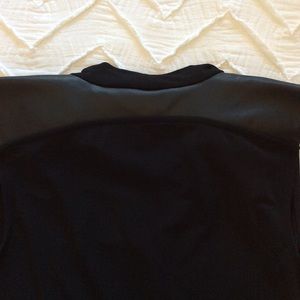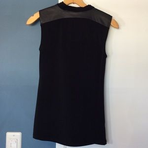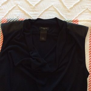 Black cowl neck sleeveless top with vegan leather detailing at the shoulders. NWOT