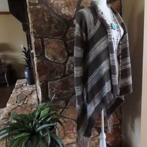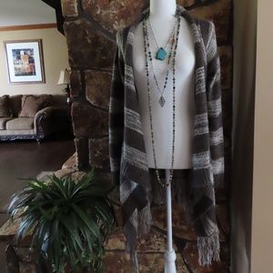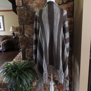 Cuddly and cool long boho style sweater. Taupe and cream stripe. Size medium. Armhole to armhole is 17". Front/side length is 26" to 44" with fringe. Back length is 35" with fringe. 80% acrylic, 10% wool and 10% nylon. No flaws