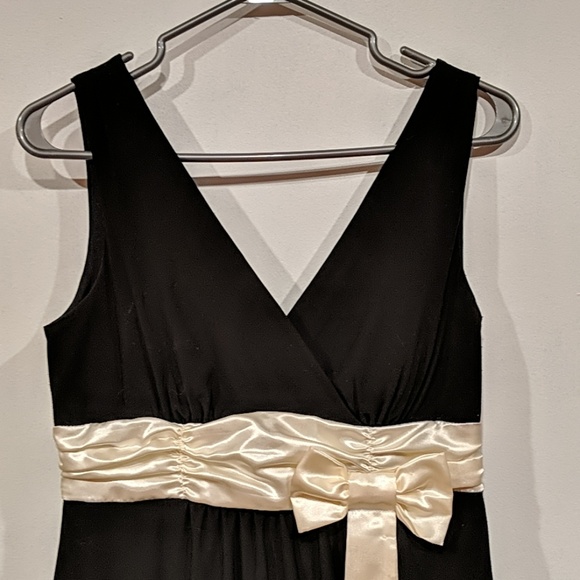 Black Jessica dress with ivory ribbon that sits under the bust. Very flattering. The cut doesn't reveal too much cleavage. Very appropriate for a wedding or formal event.