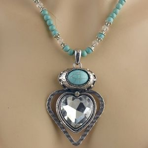 The focal point is a 2” X 3" (including the bail) heart design bling with an oval turquoise piece on top.